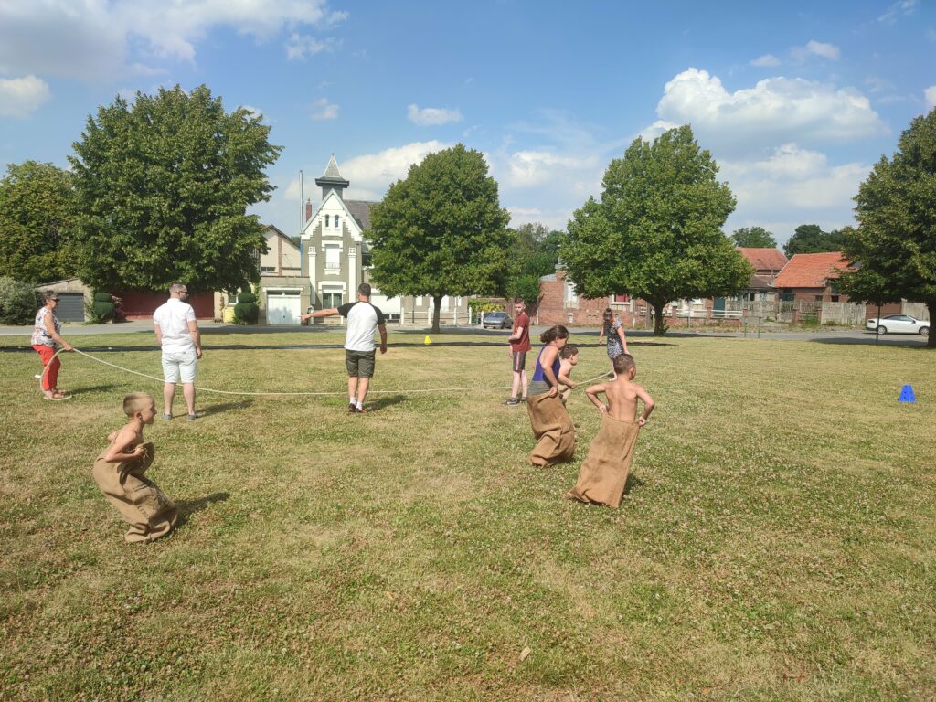 Et comme le 14 juillet est notre fête nationale et une journée de joie, nous avons organisé un repas partagé dans la cour de l’école suivi d’une après-midi festive sur la place où petits et grands ont pu renouer avec des jeux de leurs enfances : tir à la corde, casse noix, course de garçon de café, lance oeuf et le très prisé ventriglisse très apprécié par ces températures chaudes.